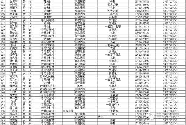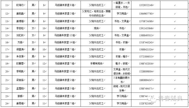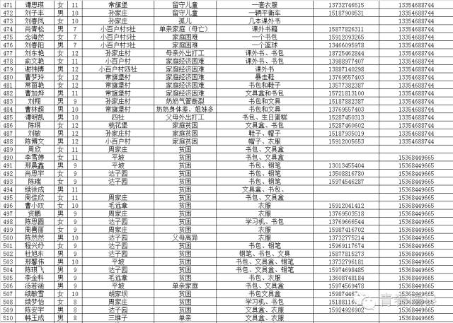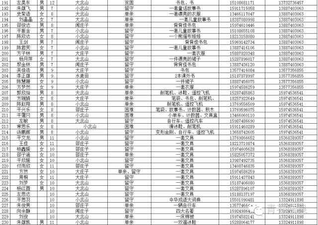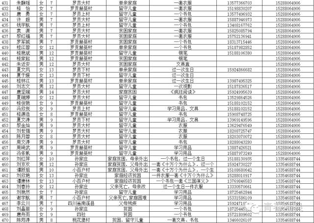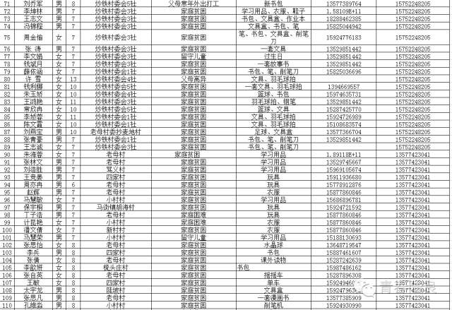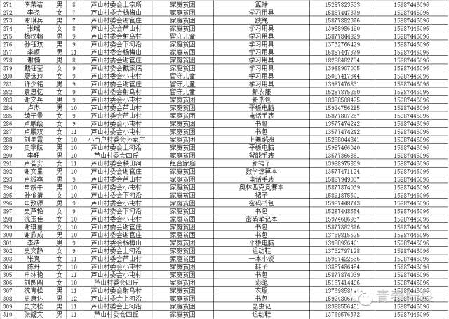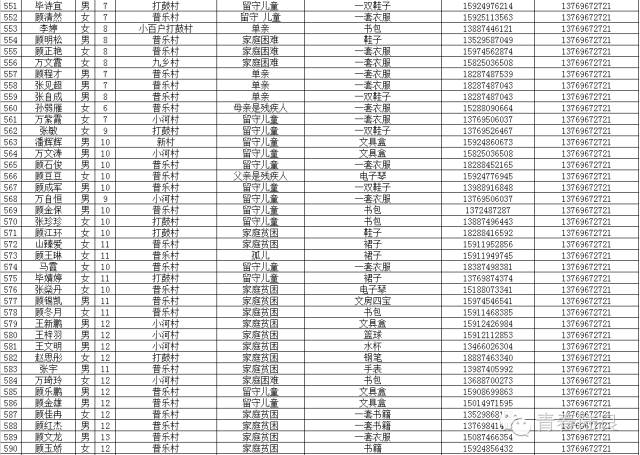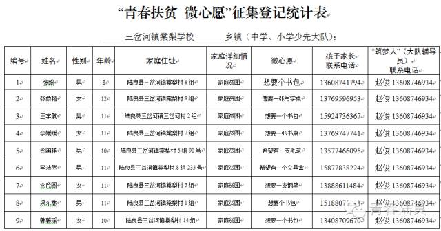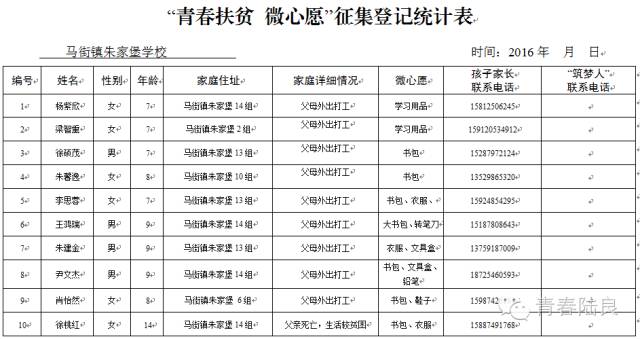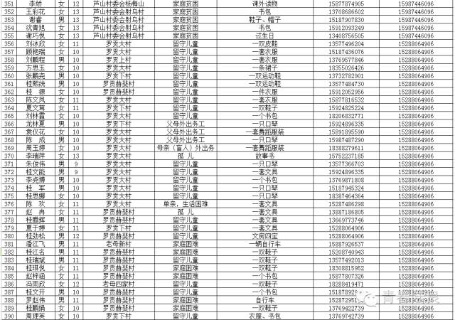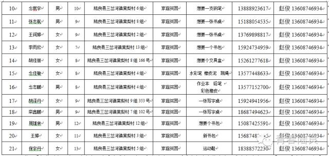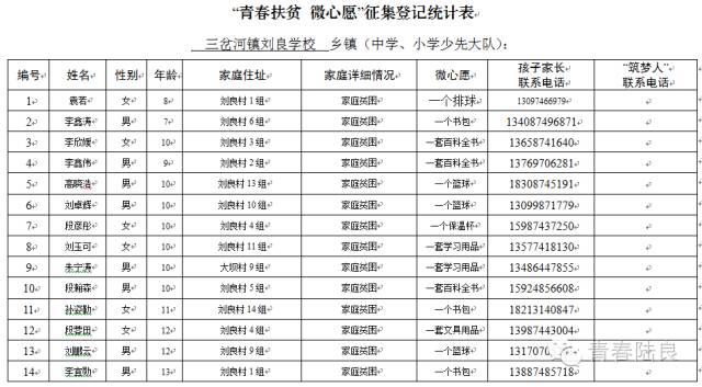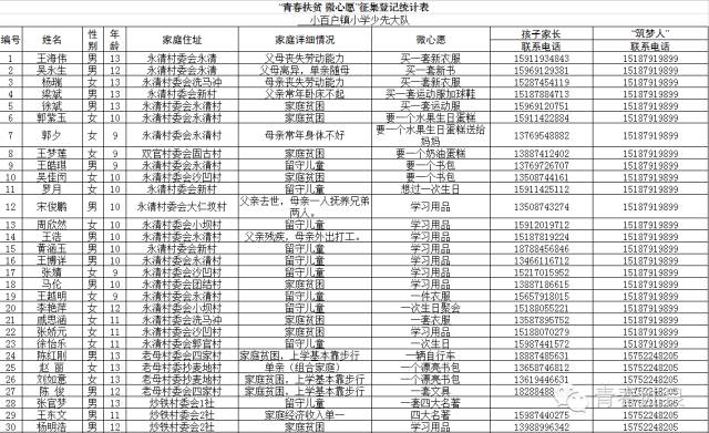 8、芳华镇戚家山小学共计40个“微心愿” 9、芳华镇狮子口小学共计37个“微心愿” 10、芳华镇小合山小学共计34个“微心愿” 11、芳华镇雍家学校共计20个“微心愿” 12、芳华镇雨补小学共计30个“微心愿” 13、华侨管理区共计9个”微心愿“ (未完待续) 青们,小小的童心需要爱的怀抱来温暖,小小的心愿需要您的行动来慰藉。如果您想参加“青春扶贫 微心愿”认领活动,请联系我们。 想认领的,可直接留言,留下你的姓名、联系电话和欲认领心愿编号。
