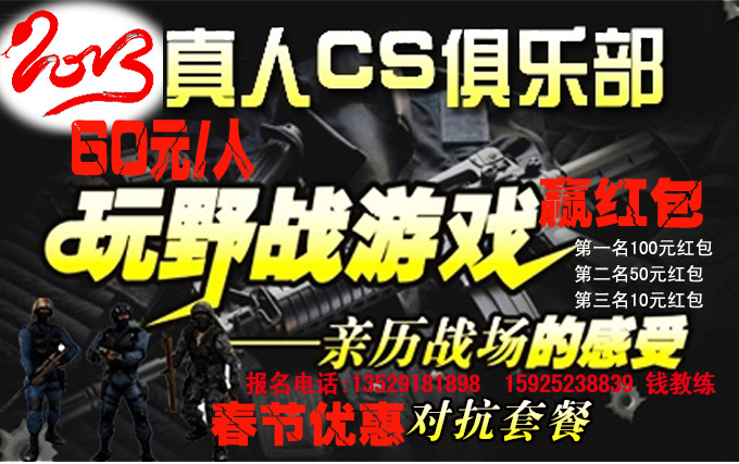 今年过年不缺钱,健健康康好过年! 2013玩真人CS激光野战游戏——春节优惠对抗套餐抢先报名中……! 团队惊爆价仅60元/人即可玩真人CS野战对抗游戏(含:真人CS激光野战1.5小时,三大战役——“大逃杀”、“遭遇战”、“攻防战”,15条生命值,弹夹不限量)!欢迎您的挑战!!! 亲历战场的刺激感受,同时还可赢起红包哦!!! 凡是参加我们的活动,只要每场次参加人数达到20人,你即刻可以享受我们的意外惊喜,红包大奖等你拿,将幸运带回家,来个开门红,具体细则如下: 每场参战人数达20人,三大战役结束,总成绩前三名将获得现金大奖(游戏结束即刻兑奖--现金)。 一场颠峰对决,三大战役问谁是英雄? 第一名:赢取新年红包人民币100元。 第二名:赢取新年红包人民币50元。 第三名:赢取新年红包人民币10元。 每场前三名可再次报名挑战2013年赢家总决赛,赢起更大礼包! 活动地址:西华公园(暂定);更多资讯请来电咨询。 注: 1、接受20人以上团队预订,20人以上团队事先谈游戏地点(一般的村庄、楼房、废弃厂房均能开展野战活动)、确定野战时间,以广场为中心点,方圆10公里可提供上门服务; 2、如团队所选游戏地址涉及到场地使用费,则场地使用费由团队自行承担; 3、仅限春节期间(正月初一至正月初六);正月初六后仅接收20人以上团队预定。 联系人:山乞教练 电话:15925238839(昆明号) 龙焱教练 电话:13529181898(昆明号) |